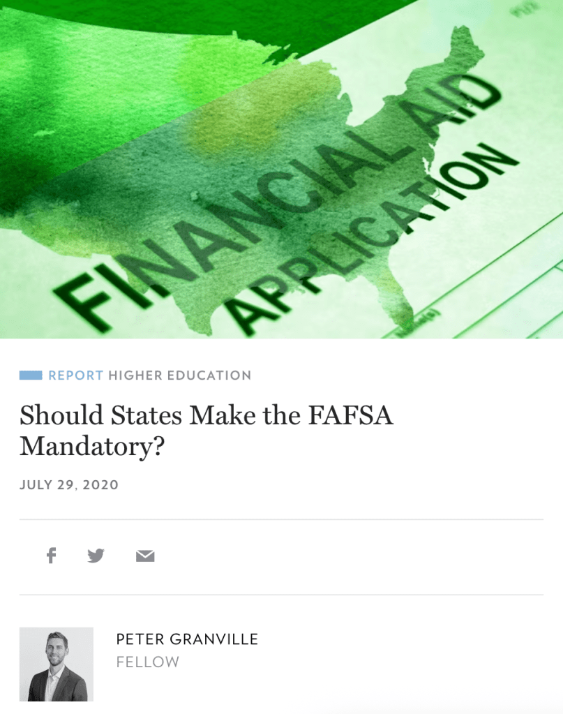 In 2020, my report Should States Make the FAFSA Mandatory? uncovered how Louisiana’s graduation requirement closed gaps by income in FAFSA completion percentage. This research has helped spur the growth of these policies across more than a dozen states. In 2025, I examined several states’ outcomes under these policies in a report titled Mandatory FAFSA Policies Have Had Immediate Impact. My research and quotes on mandatory FAFSA policies have been cited by outlets such as The New York Times and The Wall Street Journal.